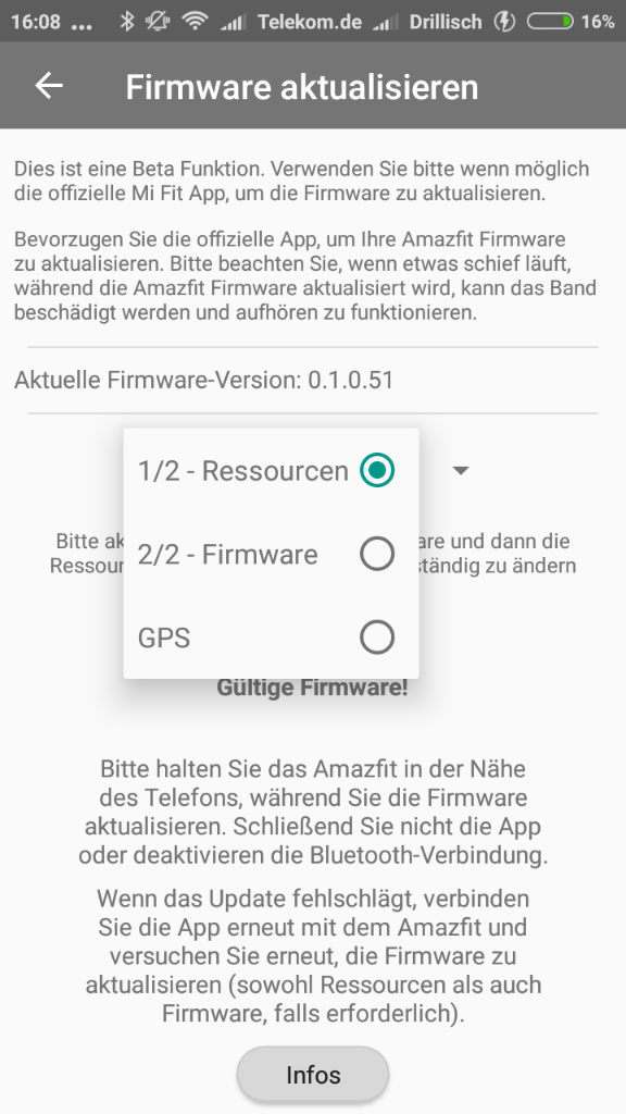 Mein erstes Update per Amazfit Notify App war die Methode "2/2-Firmware". Ich verstand es so: zwei von zwei, Firmware und Ressourcen. Damit hätte doch theoretisch beides passen müssen (Mi Fit App Update + Firmware-Update + Ressourcen-Update).