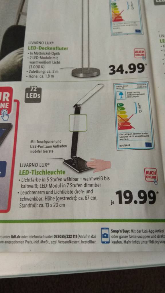 2) sieht die Lidl-Lampe so aus, als könne man die Leuchtfläche nicht nach oben richten, zur indirekten Beleuchtung. Und das ist zumindest für mich die Betriebsart, die ich ausschließlich nutze: