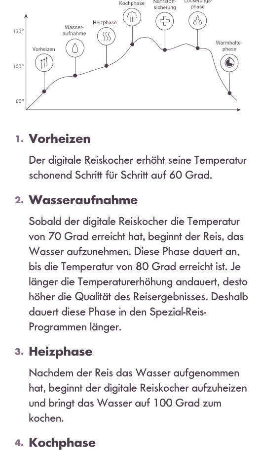 Eigentlich recht einfach zu bedienen... Auch ohne App. Rechter Knopf einfach das Programm wählen. Denke 40 Minuten ( schnell) und 1 Stunde ( optimal) reichen aus. Anschließend den mittleren Startknopf betätigen. Yogurt, Suppe, Kuchen... ist eh nur Spielerei. Wichtig ist das so ein Reiskocher erst den Reis mal quellen lässt und dann erst aufkocht.