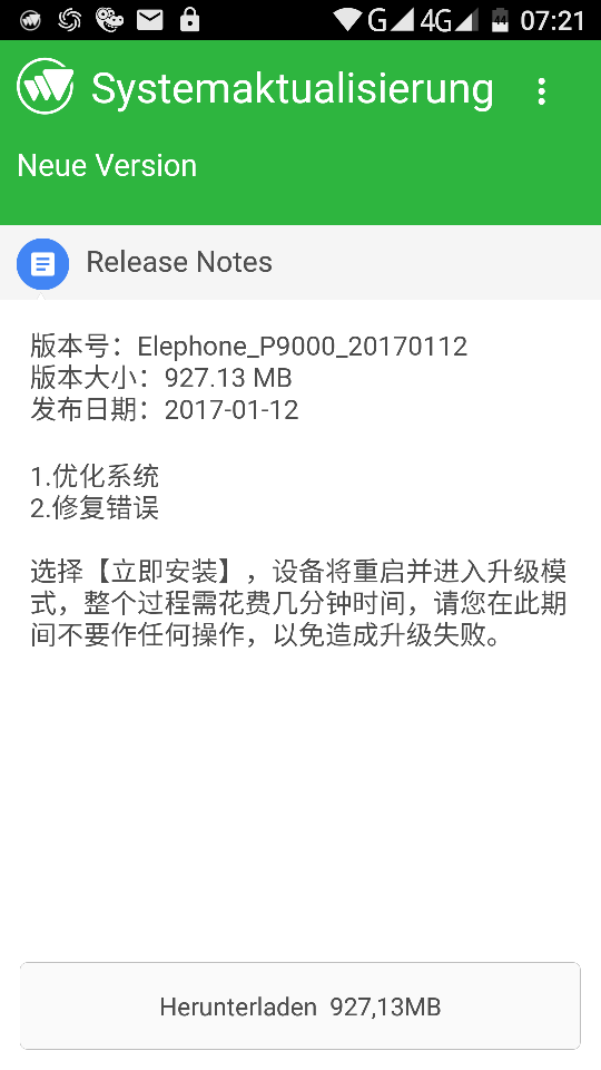 Die Versionsnummer: Elephone- P9000-20170112 Version Größe: 927,13 MB Datum: 2017-01-121 Optimierungssystem 2 Beheben Sie den Fehler, wählen Sie [Jetzt installieren], wird das Gerät in den Upgrade-Modus neu starten, dauert der gesamte Prozess ein paar Minuten Bitte nehmen Sie nicht während dieser Operation, um Aktualisierungsfehler zu vermeiden.