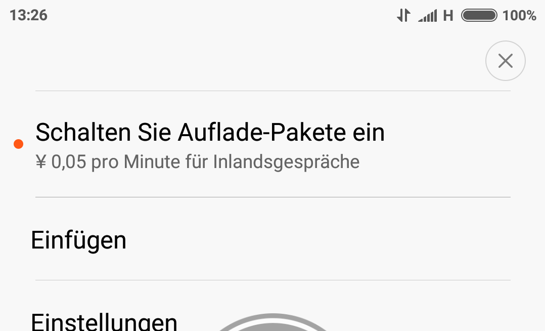 Mal was anderes: Seit meinem Update auf die Stable 7.2.1.0 habe ich im Telefon-Menu oben so einen Kreis mit einem roten Punkt, und wenn ich draufgehe, finde ich die Option, für Y (Yuan?) 0,05 Inlandsgespräche aufzuladen (siehe Fotos) ... was soll das und wie bekomme ich es weg?