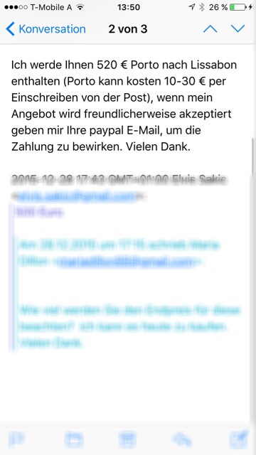 Mittlerweile bin ich es gewohnt, dass ich auf ein Smartphone für bspw. 300,-€ zuerst drei Anfragen mit: "Komme abholen für 150,-€", manchmal auch einfach nur: "150€" erhalte. Mit denen mache ich mir dann auch nen Spaß.