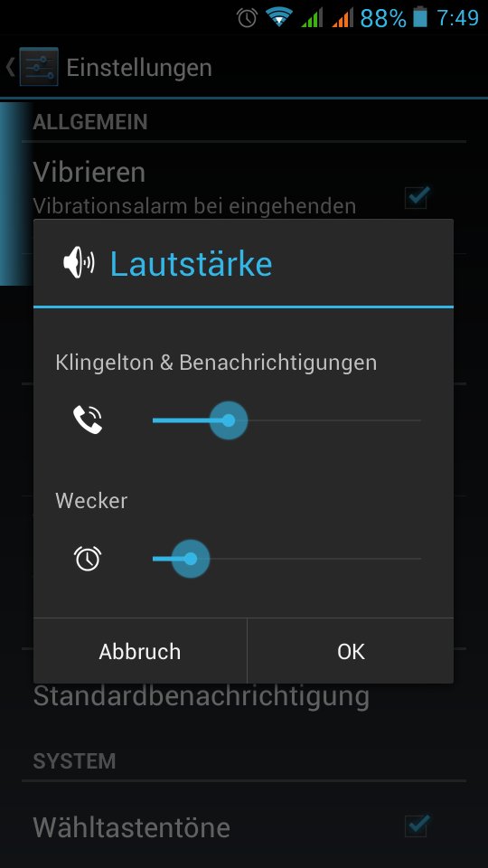 Mal ne Frage zur Lautstärkeneinstellung. Ich hatte versucht, die Lautstärke am Handy leiser einzustellen, weil Whatsapp immer so laut rummjammert, wenn eine Nachricht kommt. Dazu beutzte ich Android Assistant. Dort auf "Werkzeuge" dann auf "Lautstärke Telefon". Aber es ist nicht möglich, die Lautstärte bei "Benachrichtigungs Lautstärke" kleiner als 14 einzustellen. Wenn ich den Schieberegler keliner 14 einstelle, springt er, nachdem ich auf "OK" geklickt habe, immer gleich auf "0".