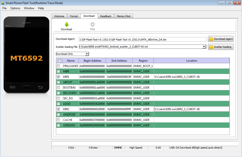 -- Dann flashen mit dem angepassten Scatterfile, den modifizierten EBR's und der Option "Firmware Upgrade". Sonst wird die PMT nicht neu gebaut... und Du kannst nicht mehr flashen.
