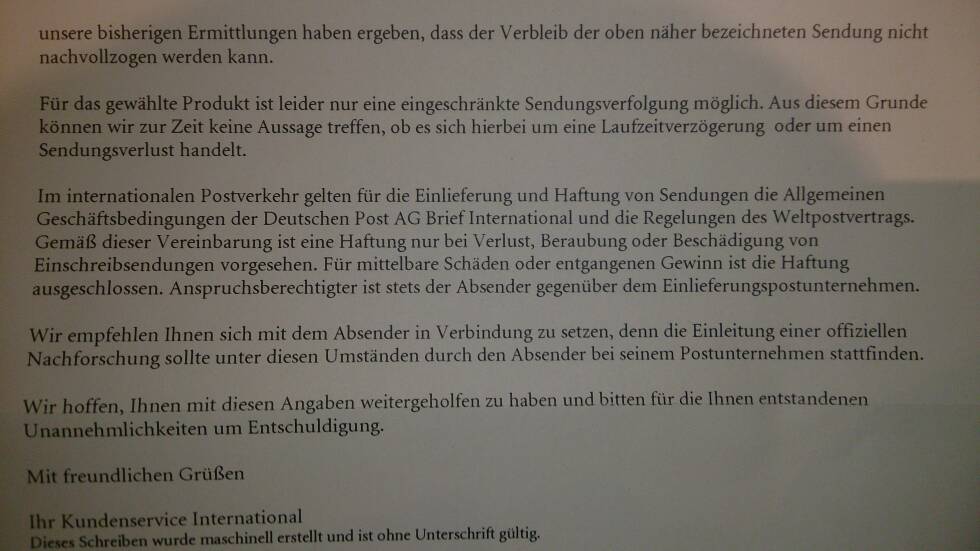 Ob die das Interessiert? Steht ja drin, ist nur eingeschränkt nachverfolgbar. Es kann sich auch um eine Lieferverzögerung handeln und du sollst dich mit dem Absender in Verbindung setzen.
