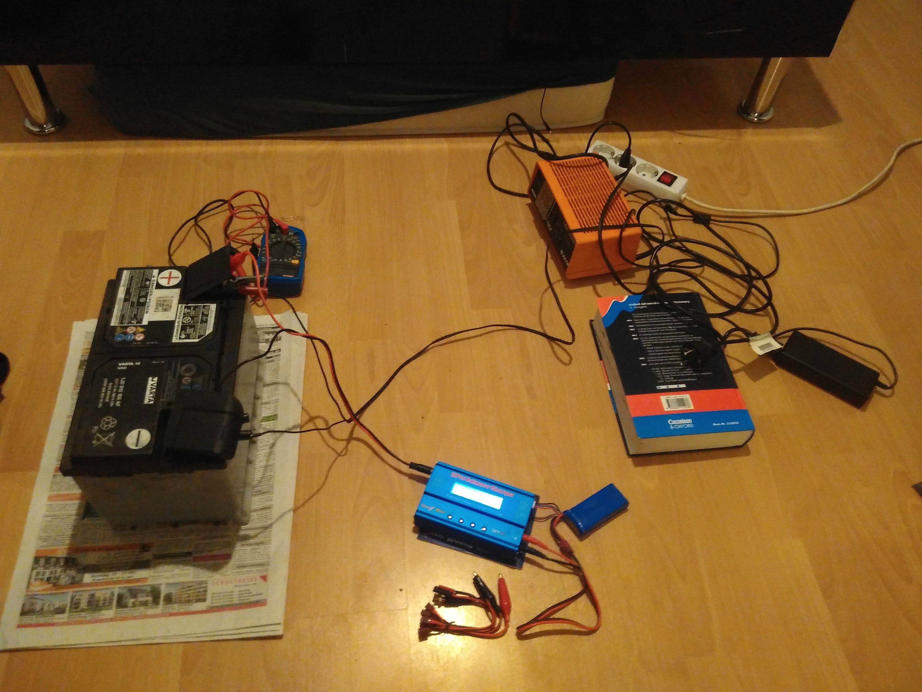 So, ich habe heute mein original SkyRC B6 Charger von der Post abgeholt und wollte gleich meine Akku Sammlung laden. Leider hat mir da erstmal das Netzteil, welches ich eigentlich verwenden wollte einen Strich durch die Rechnung gemacht. Der B6 benötigt eine Eingangsspannung von 11-18V, das Netzteil liefert 18,6V und dem SkyRC passt das gar nicht. Bricht sofort mit ner Input Voltage Error ab. Nächster Versuch war dann ein Aufladegerät für Autobatterien (der gelbe Kasten auf dem Bild). Der liefert zwar 12V, allerdings nur unter Belastung ... Ansonsten laut meiner Nachmessung 20V. Letztendlich hab ich das Problem gelöst, indem ich eine kaputte Autobatterie dazwischen gehängt hab durch welche eine Belastung entsteht und ich so bei etwa 12,6V bin mit dem Autobatterieladegerät![]()
