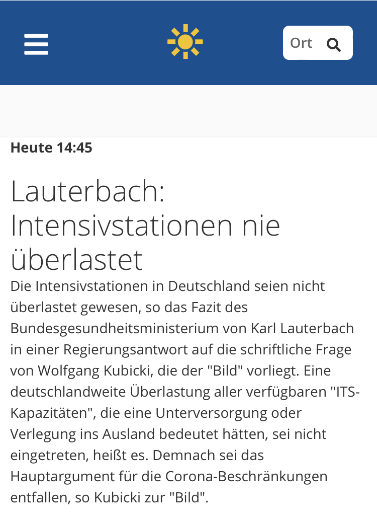 Spannend ist jedenfalls, dass bei dem von Dahmer geposteten Bild irgendwie relevante Teile der Aussage fehlen. Eine deutschlandweite, regional gleichzeitige Überlastung aller verfügbaren ITS-Kapazitäten (siehe Screenshot vom Text bei Bild selbst unten) hätte wohl jeder mitbekommen. Was aber nicht heißt, dass es nicht zu unterschiedlichen Zeiten regionale Überlastungen gab, weswegen dort Operationen verschoben wurden oder für Patienten freie Betten gesucht werden mussten. Und der Abschlusssatz im Screen ist dann in dem Zusammenhang auch recht fraglich: Warum sollte es denn keine Warnungen geben, die Kliniken waren teilweise knapp am Limit, wenn ich das richtig mitbekommen habe. Nur weil es letztendlich keinen kompletten Zusammenbruch gab, waren die Warnungen deplatziert oder wie? Und warum Kubicki meint, das Hauptargument für Beschränkungen wäre damit entfallen, ist mir auch nicht klar. Das Argument für die Beschränkungen war doch, dass der Fall der Überlastung erst gar nicht eintritt - leiden die alle an Demenz?