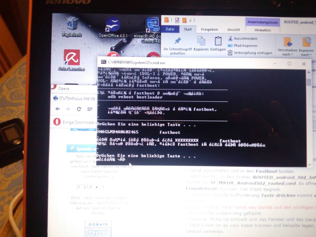 - Jetzt, am PC, in den Ordner ROOTED_android_502_Infocus_M810_by_titovich und startet die !if_M810t_Android502_rooted.cmd. Es öffnet sich ein Fenster, hier zweimal Eingabetaste drücken. Der Flash beginnt.