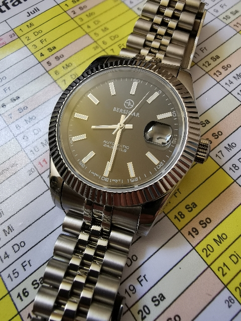 Sunburst gray ist das Zifferblatt eigentlich nicht, aber auch nicht tiefschwarz. Vielleicht ist der Farbton durch ein Saphirglas anders als durch ein Mineralglas.
