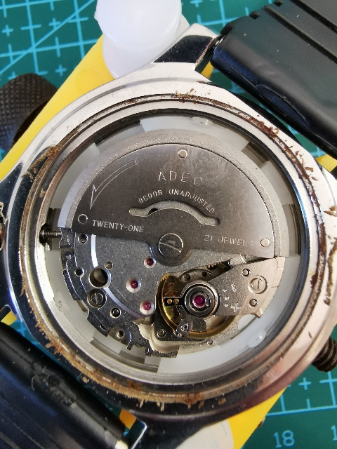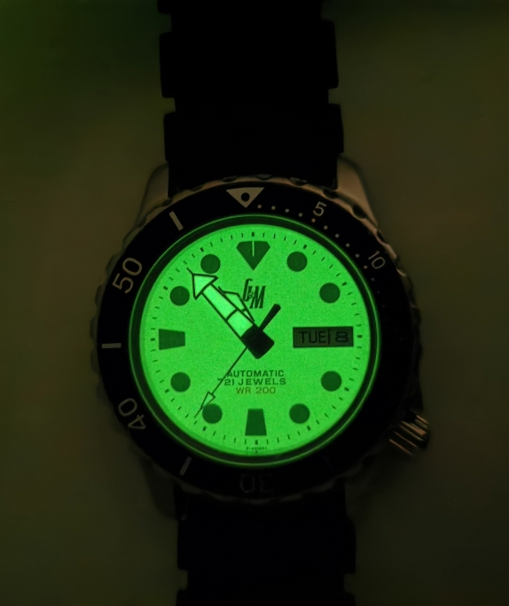 Der Leuchtkeks ist eine umgelabelte Adec, eine Untermarke von Citizen. Darin werkelt ein Citizen 8200 wie beim großen Bruder von Citizen.
