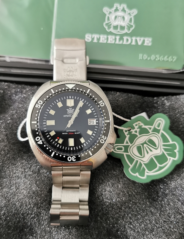 So nach langer langer Wartezeit und nachdem ich inzwischen mit Steeldive schon Kontakt aufgenommen hatte, weil ich vermutete, dass die Uhr auf dem Transport verloren ging, ist sie heute doch noch eingetroffen - meine Captain Willard oder Turtle Hommage?