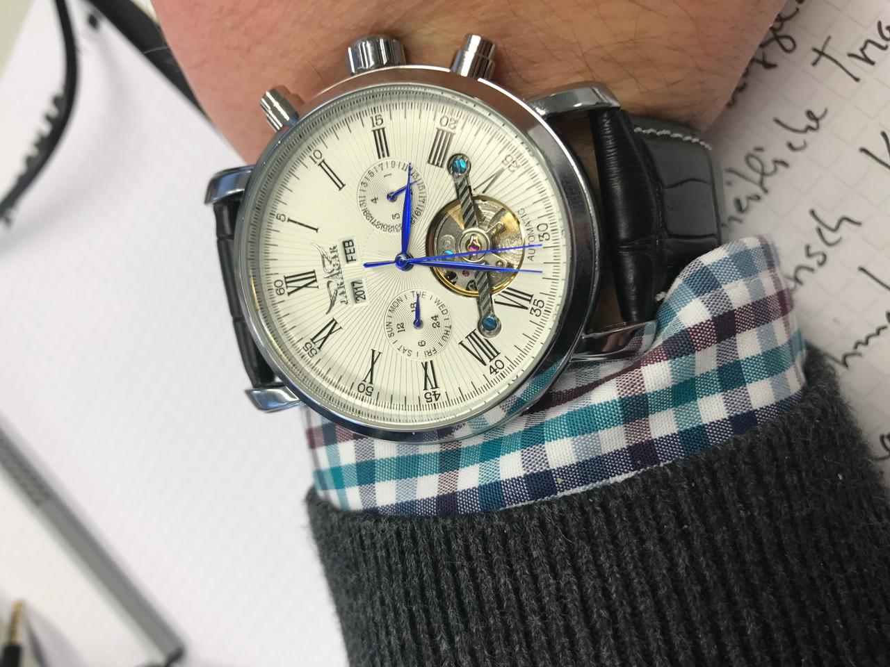 Das Pendel dreht sich auch hier relativ schnell. Gangreserve besser als bei den anderen Jaragar Uhren die weniger kosten. Hier sicher 24h Stunden kann ich bestätigen.