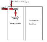 nun tastet ihr die Innere Stoffoberfläche mit dem Magnet oder Reißzwecke oberhalb ab . Sobald der Magnet oder Reißzwecke heften bleibt habt ihr den Flipcase Magnet ( Den Bösen Übeltäter ) gefunden . Schneidet diesen nun mit einem scharfen Messer am besten Teppichmesser vorsichtig durch 3 Schnitte herraus . zum Schluß klebt ihr das umgeklappte Stoffteil einfach wieder mit Kleber SORGFÄLTIG an. Und fertig :) Siehe Skizze.