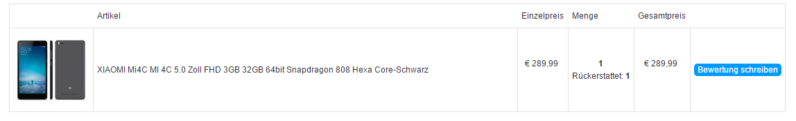 Morgen, die Bestellnummer ist 400232206. Diese habe ich auch bereits in der Email sowie dem Paypal Konflikt mitgeteilt. Es geht mit außerdem nicht darum, dass es schon geöffnet wurde, sondern darum, dass KEIN HANDY in der Verpackung war, lediglich die leere Xiaomi Verpackung. Beim Paypal Konflikt habe ich die Antwort bekommen "Hallo, wenn Sue ein leer Paket bekommen, bitte geben Sie uns die Ausweiss von DHL." Worunter ich mir nicht sehr viel vorstellen kann, was genau erwartet man hier von mir?[DOUBLEPOST=1454572799,1454572454][/DOUBLEPOST]Weitere Frage noch, wenn ich meine Bestellung ansehe fällt mir das gerade auf: