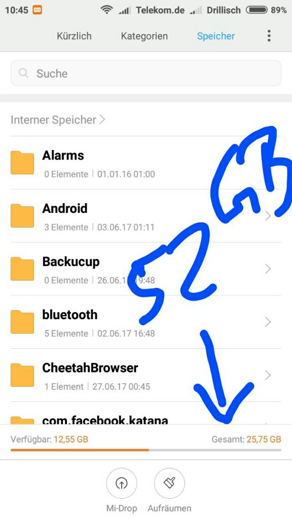 Nur das Backup 1 konnte ich einspielen, dann wurde mir aber mit dem Miui-Dateimanager eine utopische und falsche Gesamtspeichergröße angezeigt (siehe Bild; dort waren um die 52GB zu lesen).